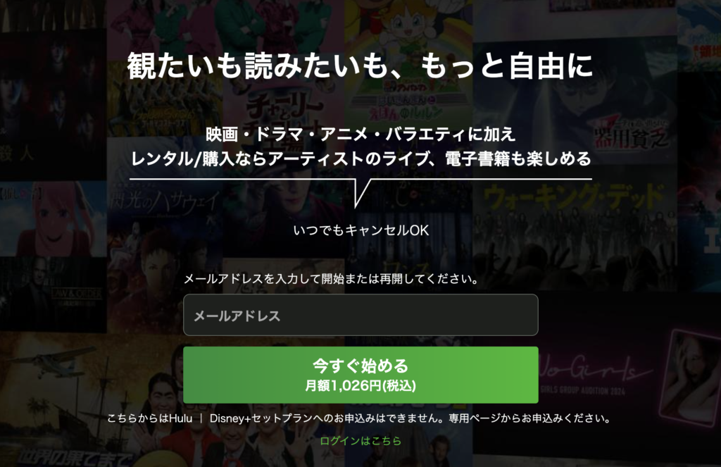 | Huluプラン | 1,026円 | 14万本以上の作品が見放題(※iTunes決済は1,050円) |